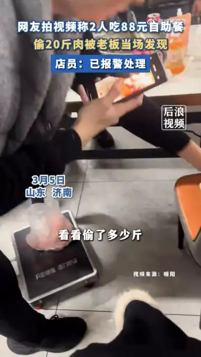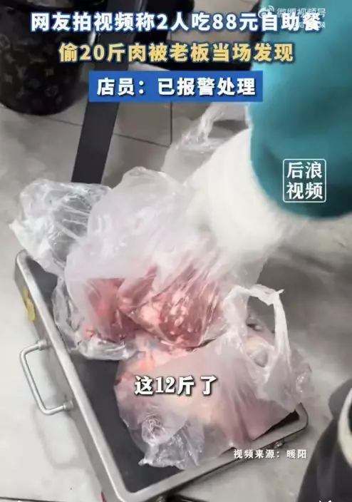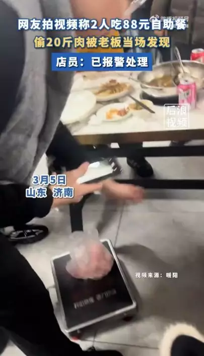 由網傳畫面可見,一名疑似是火鍋店老闆的眼鏡男將桌前4袋裝滿生肉的塑膠袋放上秤台,「看看偷了多少斤?」一旁有人驚呼,「哎呀,我的媽呀,怎麼這麼多」。眼鏡男又回,「坐了一下午,偷了一下午」。據拍攝者透露,「聽說2人是從下午吃到晚上,可沒少(吃)」。