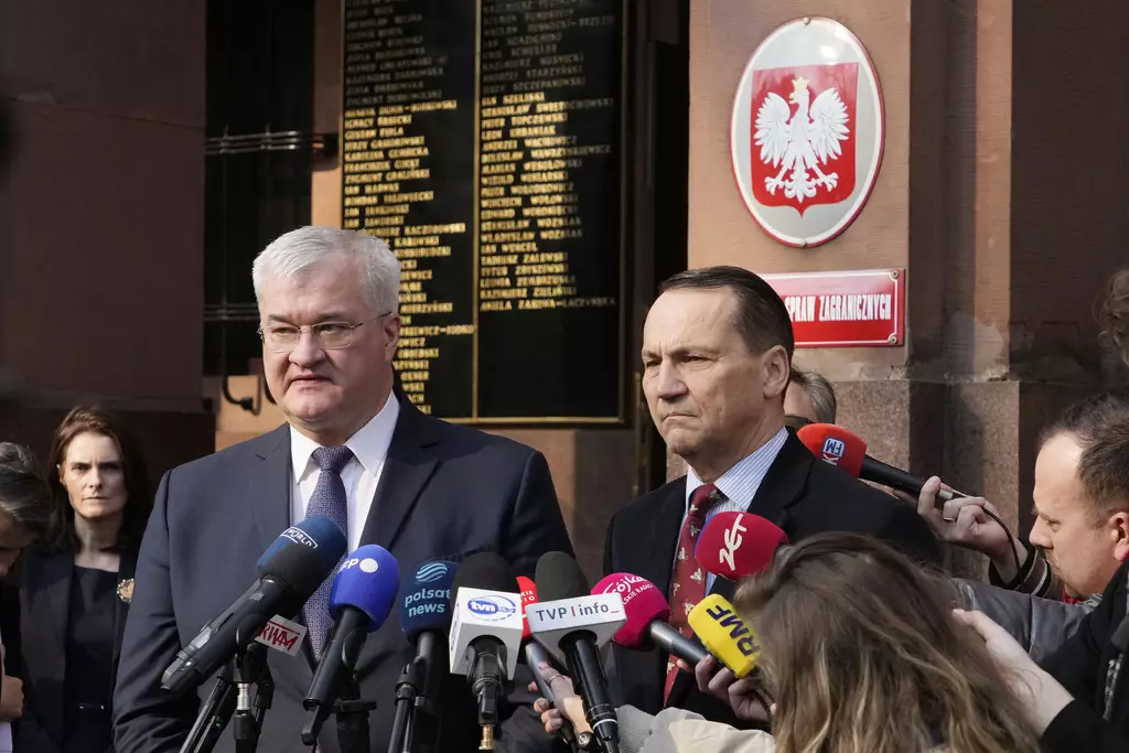 波蘭外長西科爾斯基(右)星期三(3月12日)在華沙與烏克蘭外長瑟比加(左)會面後舉行的聯合記者會上證實,美國已恢復對烏克蘭的軍事援助。(AP圖片)
