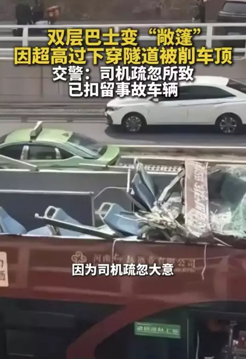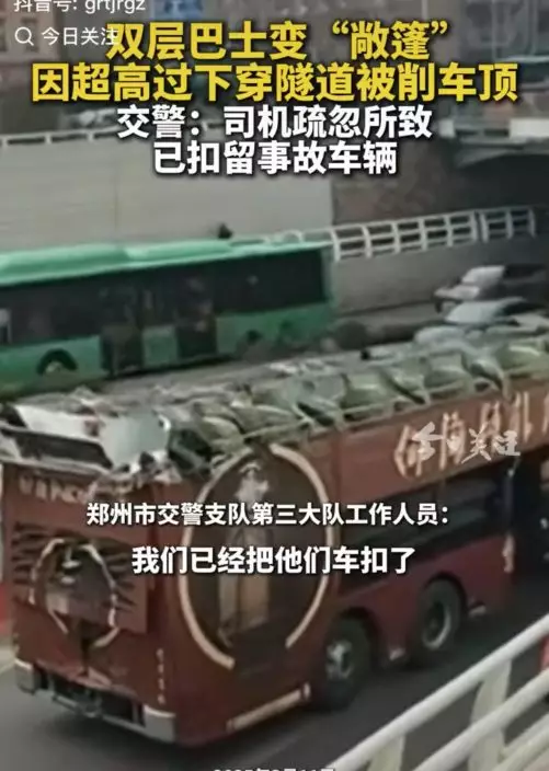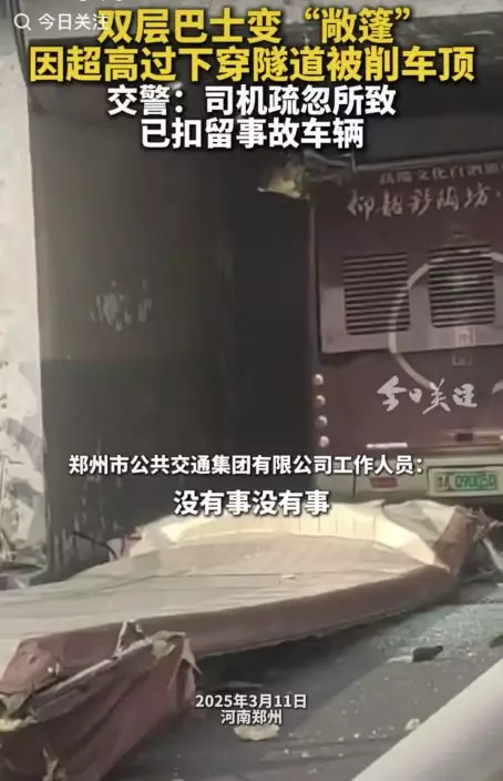 綜合內媒報導,河南鄭州一名新入職的女司機星期二(3月11日)駕駛觀光雙層巴士駛入二七區正興街一處下穿京廣鐵路的橋下隧道時,由於該處隧道有限高,因此巴士由東向西行駛時,與隧道頂部發生劇烈碰撞,導致上層車頂被當場掀翻變成「敞篷巴士」,現場路面佈滿車體碎片。