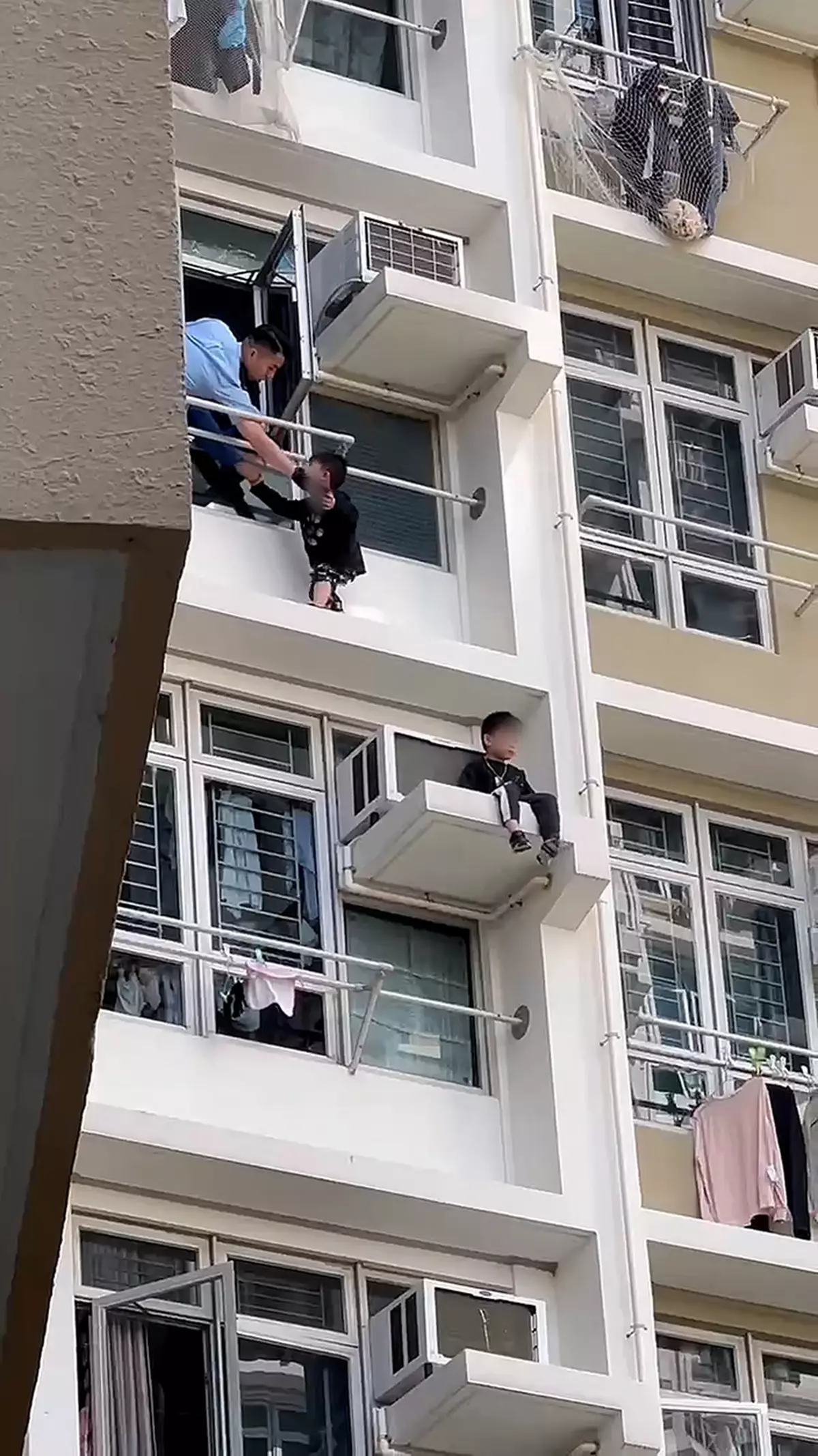 粉嶺皇后山邨皇樂樓一個單位,有兩名幼童分別危坐大廈外牆及冷氣機窗台,警員伸手救回其中一名男童回到屋內。網上圖片