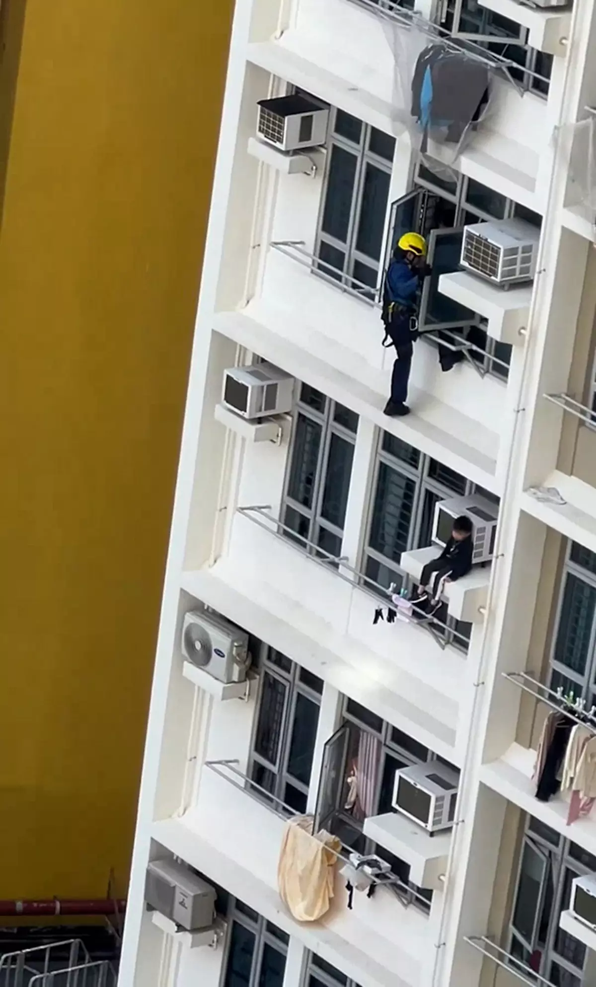 網上片段所見,兩名穿着黑色長袖衫的男童,分別危坐大廈外牆石壆和下一層單位的冷氣機窗台上,兩童雙腳垂在半空「吊吊揈」,看似不懂害怕。不過,樓下街坊就看得嚇破膽,議論紛紛。現場工作人員一直勸喻大家向後移,免得嚇倒危坐的兩個小朋友。