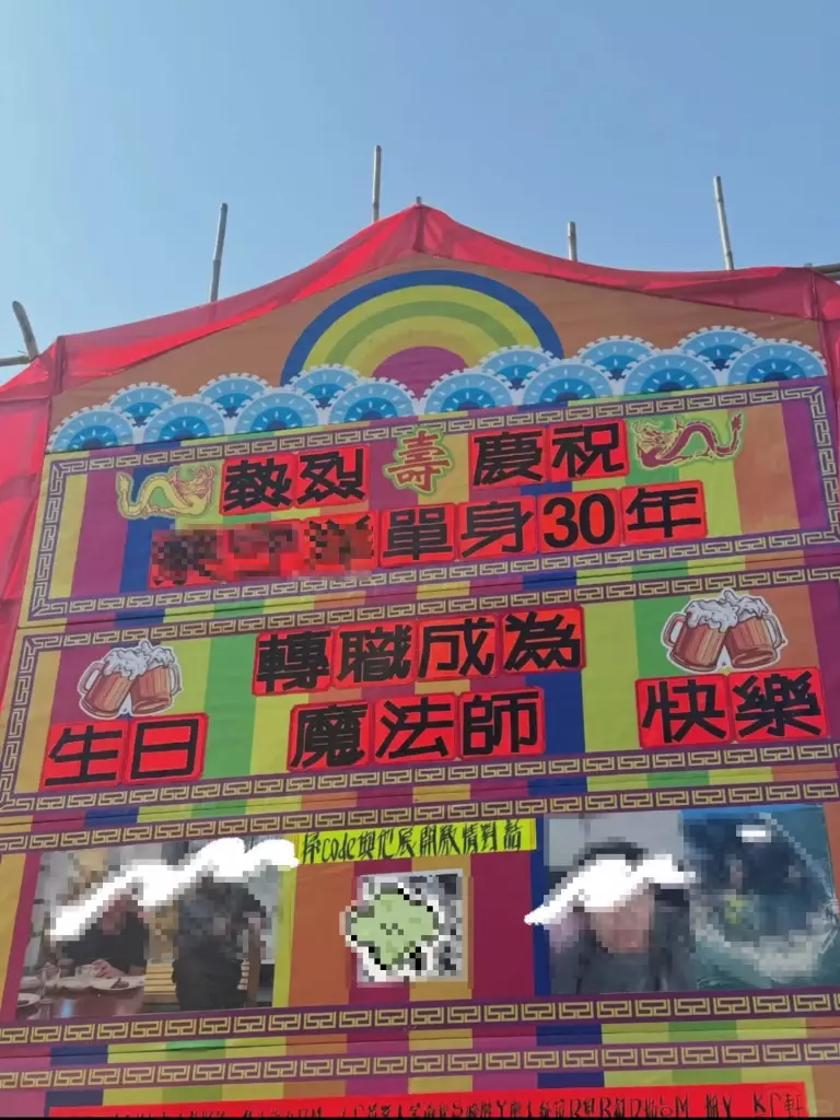 據該網友分享的相片可見,長洲碼頭岸邊放有一列慶賀結婚的花牌,上面寫着「甜甜蜜蜜」、「幸福美滿」、「百年好合」等祝福字眼,而前方更有2個舉行型花牌高掛棚架上,慶賀新人喜結連理。