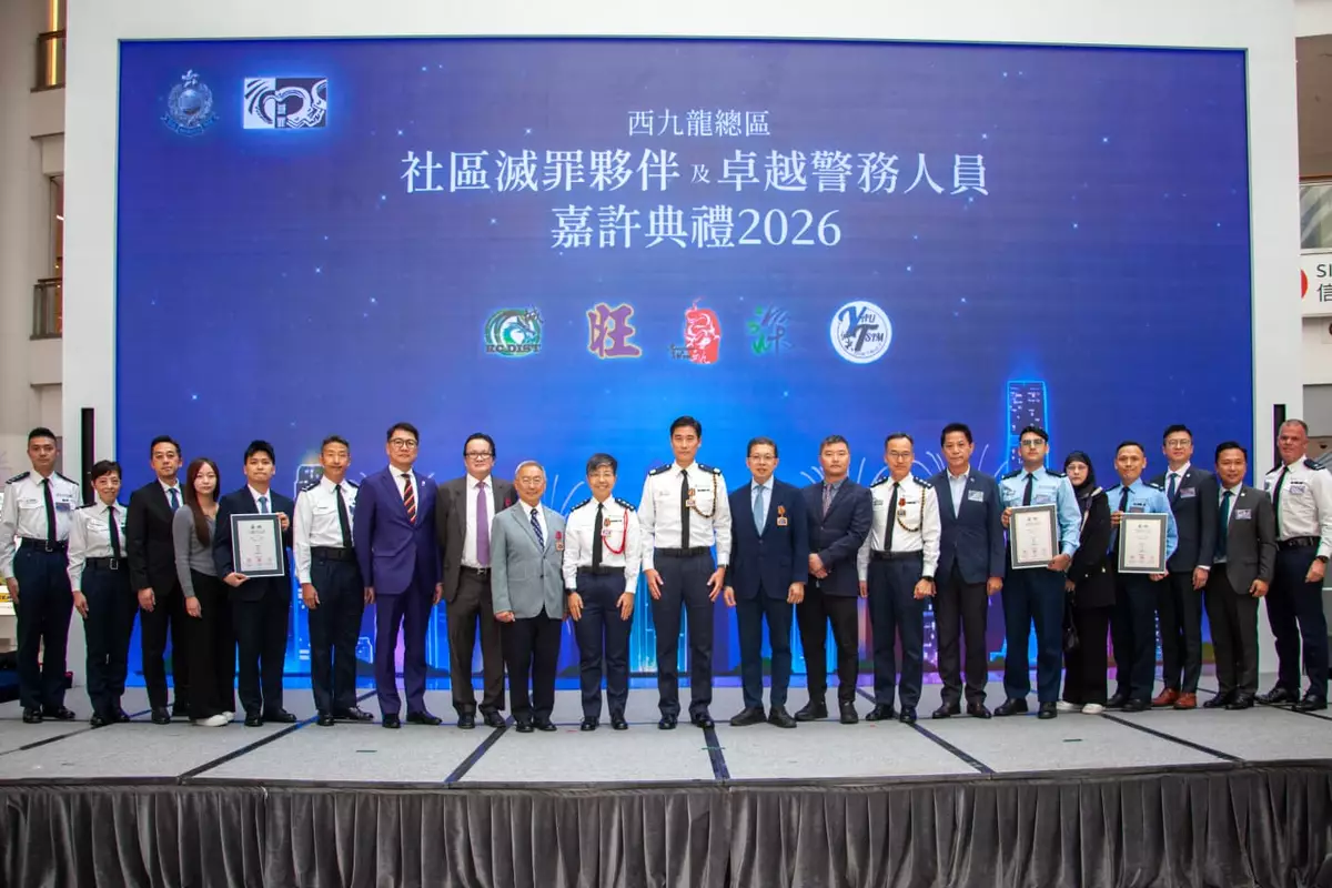 為表揚過去一年積極推動社區安全及滅罪工作的社區夥伴,以及表現卓越的警務人員,警務處西九龍總區星期一(3月9日)圓滿舉行「西九龍總區社區滅罪夥伴及卓越警務人員嘉許典禮2026」。
