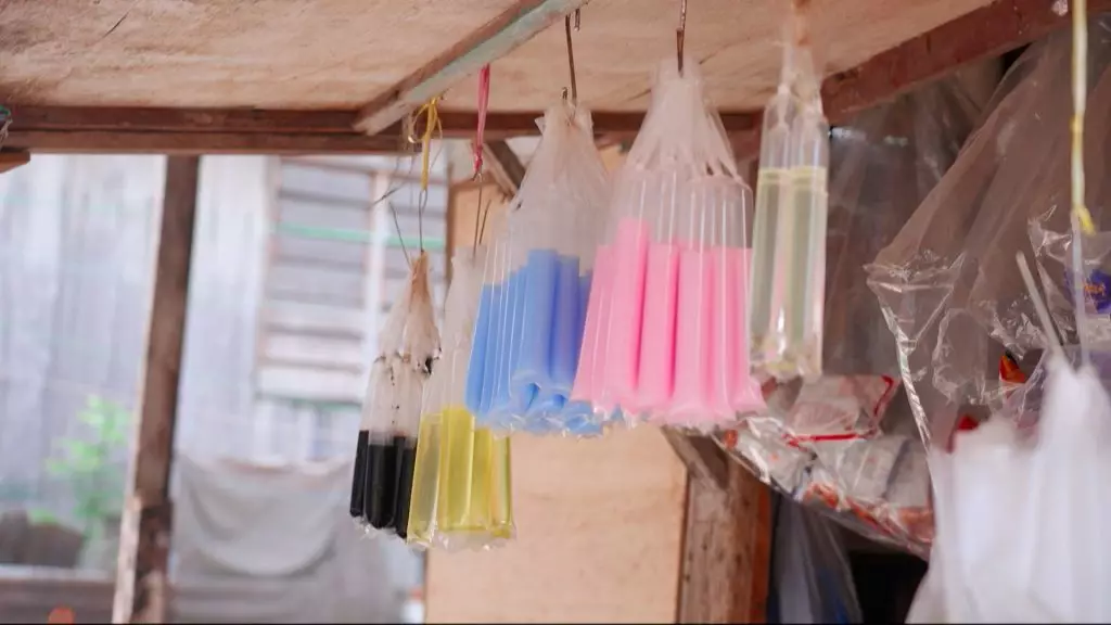 二人見到村民用膠袋裝着七彩顏色的液體,起初以為是當地飲品。