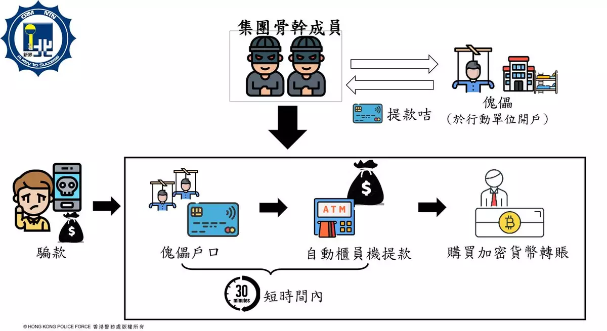 開戶之後,傀儡戶口持有人收到一些金錢回報,之後將銀行咭及密碼交給集團,讓傀儡戶口成為集團的洗黑錢工具。 當傀儡戶口有騙款存入後,集團成員隨即從這些銀行戶口以現金提取騙款,集團往往在騙款存入後短至半小時內就將餘額全數提取。部份現金亦會隨即存入加密貨幣戶口再轉賬,以逃避警方的追查。