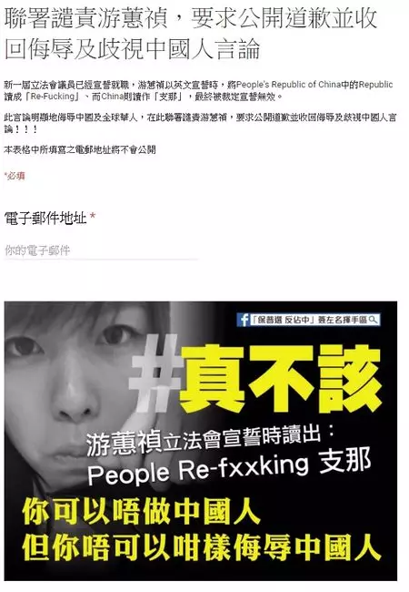 游蕙禎選擇以英文宣誓,將「中華人民共和國」的英文讀成「Re-fxxking of 支那」,網民大罵不知所謂,話佢「冇資格當選議員。」發起聯署的網頁指,游蕙禎言論「明顯地侮辱中國及全球華人」,譴責佢之餘仲要求佢公開道歉並收回言論。