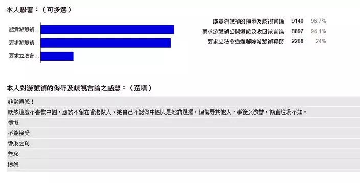直到午飯時間,已經有9000幾人聯署咗,超過9成人譴責游蕙禎同埋要求佢公開道歉及收回言論,約1成人更要求立法會通過解除佢嘅職務。有聯署網友留言,除了指責游蕙禎不配做議員,仲話佢︰「既然這麼不喜歡中國,應該不留在香港做人。她自己不認做中國人是她的選擇,但侮辱其他人,事後又狡辯,簡直垃圾不如。」