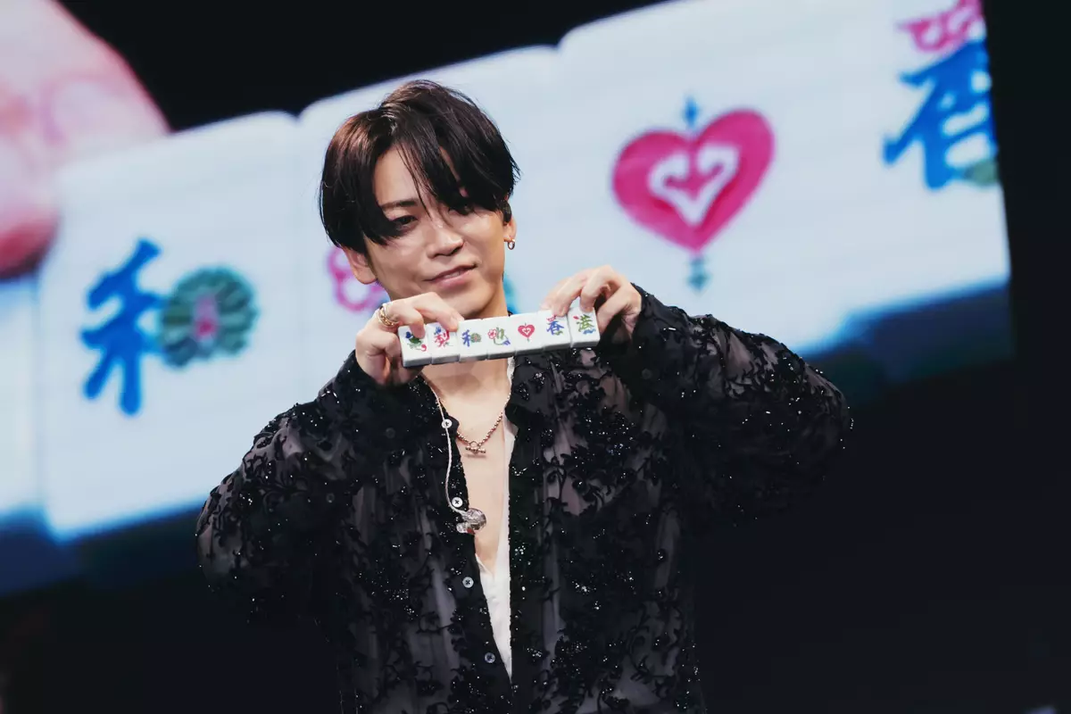 龜梨親自挑戰麻雀「甩牌」,成功砌出「龜梨和也❤香港」字樣。