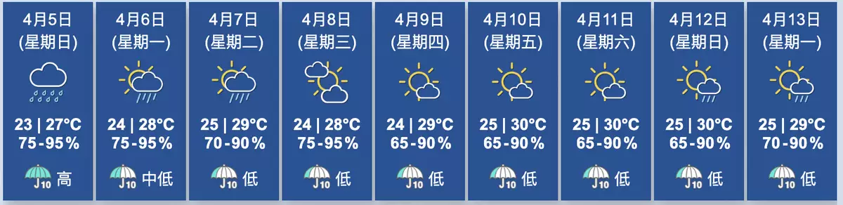 展望未來兩三日大致天晴,日間炎熱。下週中期短暫時間有陽光,亦有幾陣驟雨。