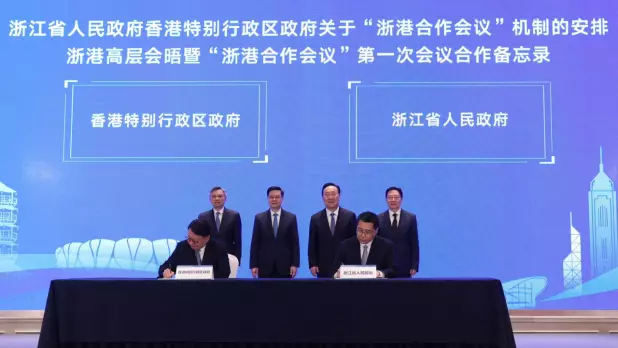 正率團訪問浙江的行政長官李家超,與浙江省委書記王浩共同出席「浙港合作會議」第一次會議,見證「浙港合作機制」正式成立。