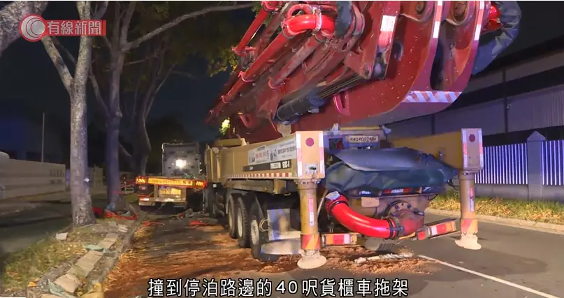 泥頭車沿宏利街向福喜街方向行駛期間,撞上停泊路邊的拖車。有線新聞影片截圖
