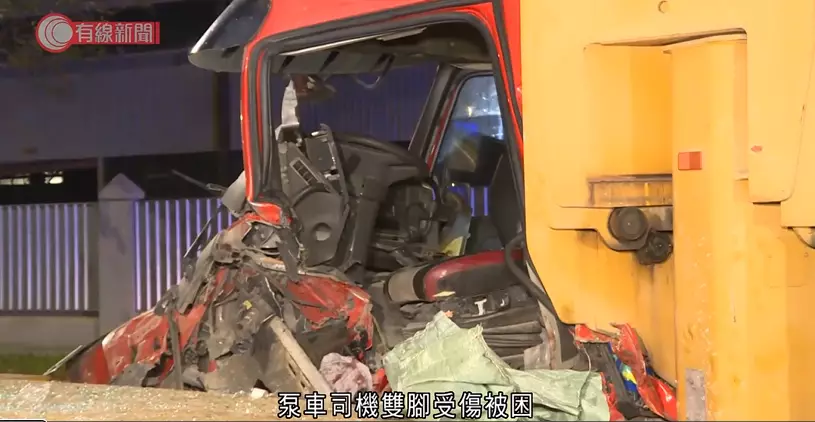 泥頭車車頭被撞至嚴重變形。有線新聞影片截圖
