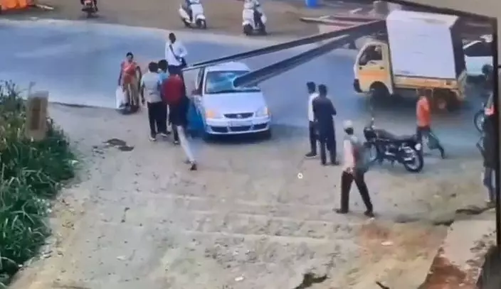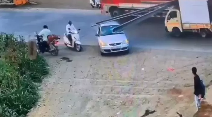綜合外媒報導,印度馬哈拉施特拉邦科爾哈普爾市日前發生一起「恐怖車禍」,宛如《死神來了》電影情節上演般。當天,一輛載有4名乘客(2男2女)的私家車在行駛期間準備穿越馬路,對向一輛小貨車見狀緊急剎車,結果車上載運的多條鐵條突然向前滑出,直插進私家車的擋風玻璃,僅差幾釐米就擊中司機和前座乘客。