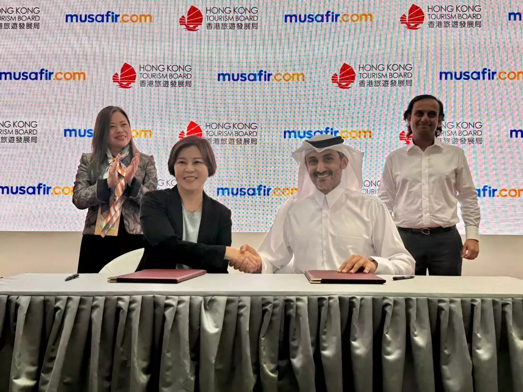 羅淑佩出席2025年阿拉伯旅遊市場展,在香港館見證香港旅遊發展局與中東的主要旅行代理商Musafir.com簽署合作備忘錄,就未來合作訂立框架。政府新聞處圖片