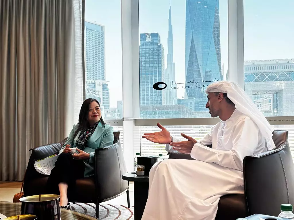羅淑佩(左)與迪拜未來基金會行政總裁兼迪拜體育委員會副主席HE Khalfan Belhoul(右)進行交流。 政府新聞處圖片