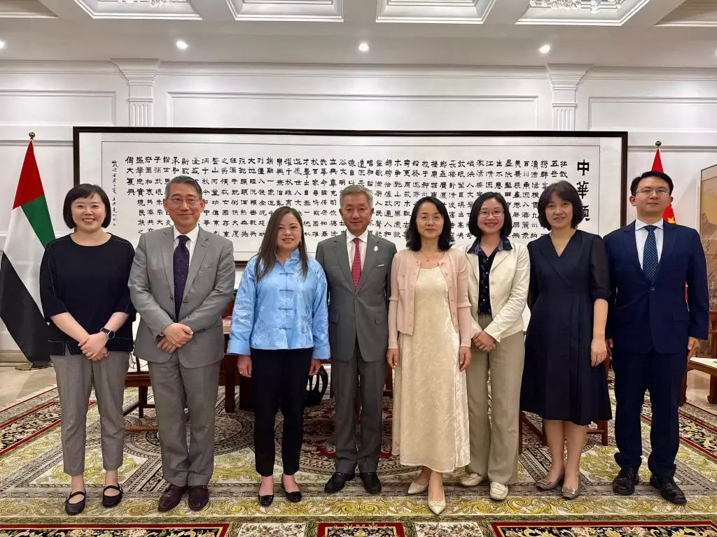 羅淑佩拜會及出席由中華人民共和國駐阿聯酋特命全權大使張益明所設的晚宴。圖示張益明(左四)及其夫人(右四)與羅淑佩(左三)、旅遊事務副專員朱瑞雯(右三)和香港駐迪拜經濟貿易辦事處處長陳尚文(左二)合照。 政府新聞處圖片