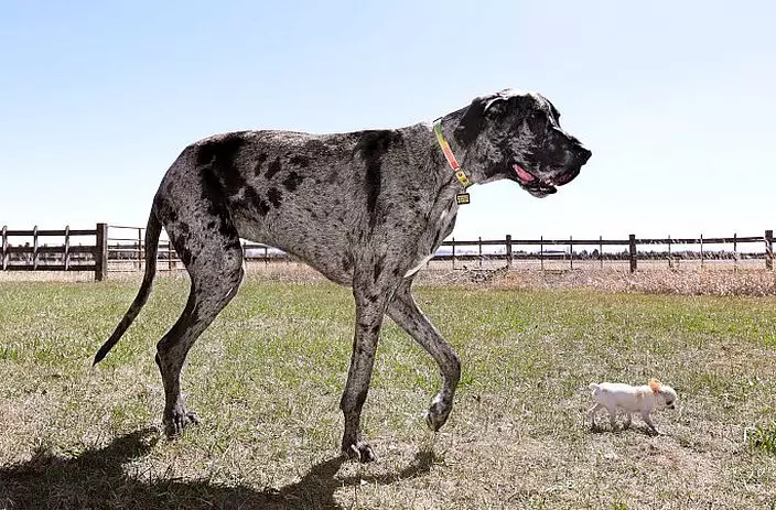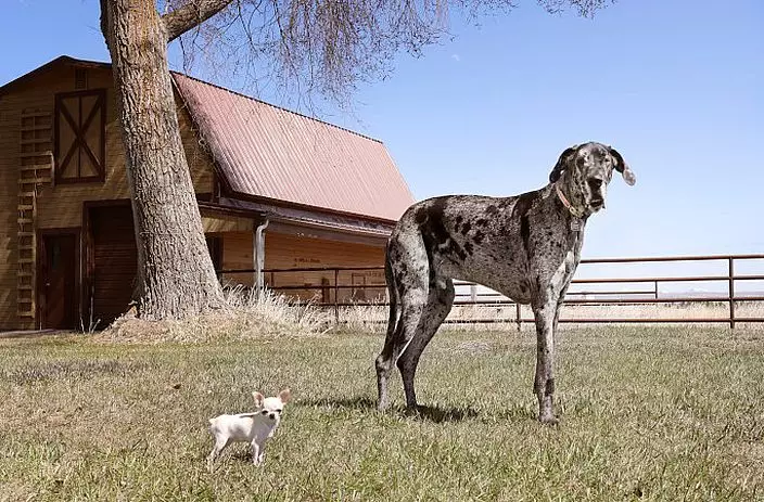 《健力士世界紀錄》報道,7歲的大丹犬雷金納德 (Reginald) 和4歲的芝娃娃珀爾 (Pearl),在愛達荷州雷金納德主人的家中,一起度過了一次破紀錄的狗狗玩耍時光。雷金納德的主人薩姆表示,愛犬雖然個子很高,但實際上只是一個大嬰兒,行為舉止就像一個蹣跚學步的小BB。