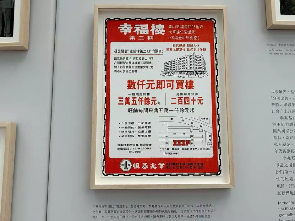 《李兆基博士紀念展—和光同塵》一連5日在中環舉行,圖為當年的樓盤廣告。巴士的報記者攝