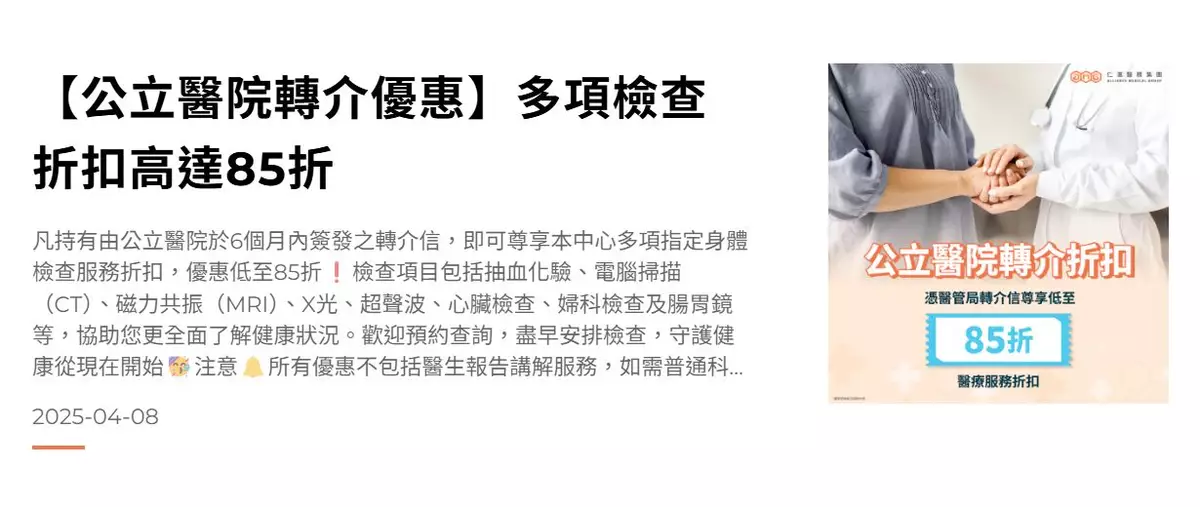 仁滙醫務集團的網頁顯示,上月仍有推出指定身體檢查折扣優惠。網頁截圖