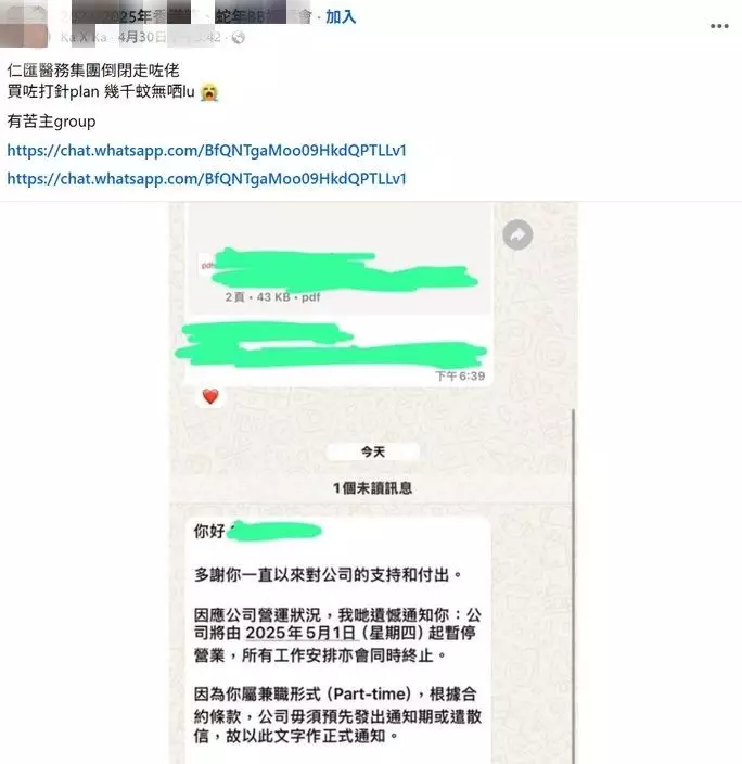 有網民在社交平台貼文指懷疑仁匯倒閉,已成立苦主聯盟跟進。 FB截圖