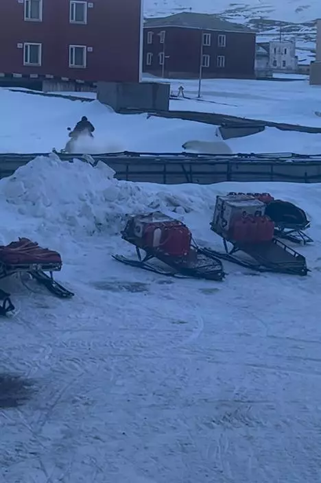 《今日美國》報道,事發於4月27日,片段可見北極熊靜悄悄走近,一名男子得到同伴警告,馬上拿起信號槍,至少開了一槍警告北極熊,但牠沒有理會,男子見勢識不對,掉下信號槍,衝向附近的一輛雪地電單車,上車後馬上加快速度,駛向安全地帶,北極熊最終放棄了,坐在雪地裡。