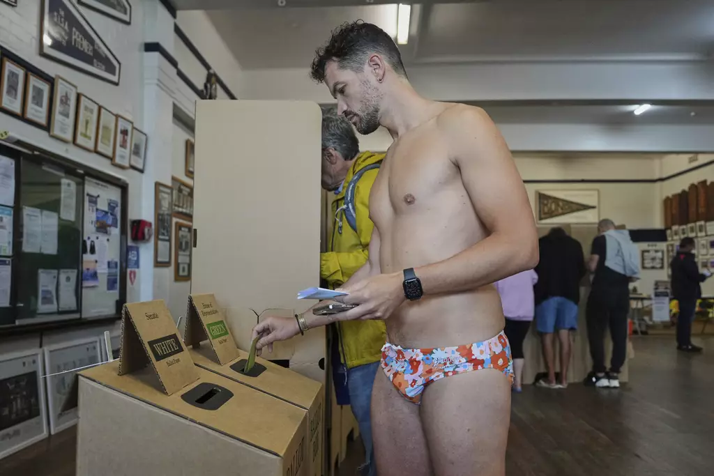 一名男選民在悉尼邦代海灘票站投票。AP圖片