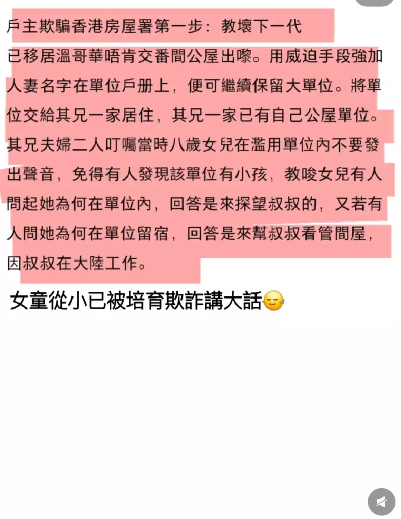該名舉報者詳細描述涉事單位情況,指戶主夫婦已移民加拿大溫哥華多年,卻未按規定交還公屋。更離譜的是,戶主在未經妻子同意下,擅自將妻子登記為住戶,並讓其兄長一家長期佔用單位。兄長不僅已擁有自己的公屋單位,還教導8歲女兒若被查問要謊稱「來探望叔叔」,明顯涉及虛假申報。
