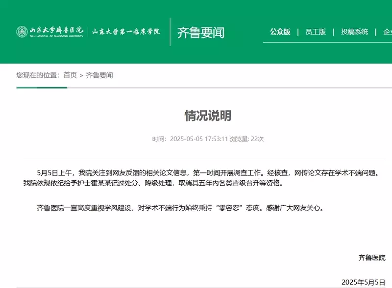 山東大學齊魯醫院一名護士論文,指子宮肌瘤有男性患者,事件在內地引起輿論嘩言。齊魯醫院傍晚通報指,經過核查,網傳論文存在學術不端問題,依規給予護士記過處分、降級處理。