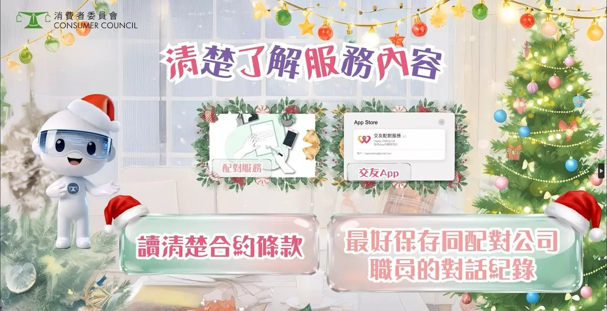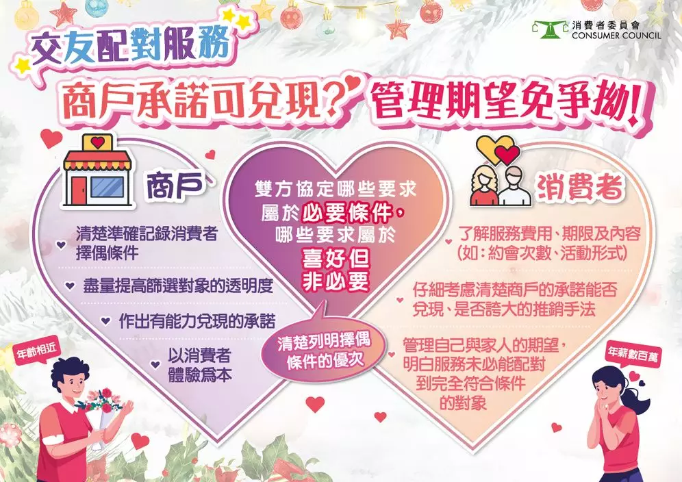 消委會呼籲業界盡量提高篩選對象的透明度,別作出難以兌現的承諾,交友程式營運商亦可考慮改善用戶註冊流程。消費者及其家人亦應管理本身的期望,使用交友程式時亦要提高警覺。