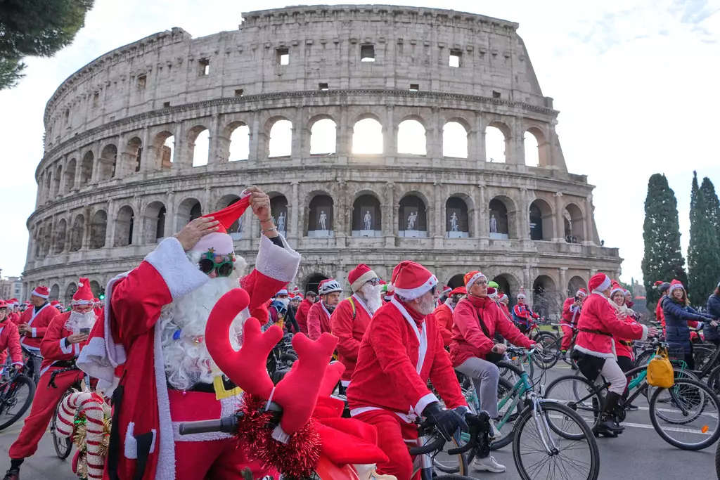 意大利的聖誕老人就在鬥獸場外踏單車慶祝聖誕。