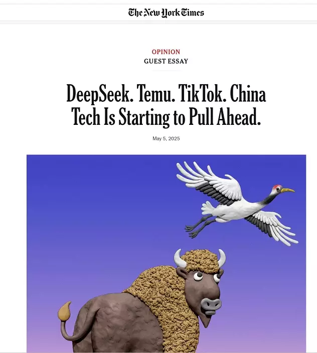 施密特在《紐時》發表評論文章,題為「從DeepSeek到Temu,再到TikTok……中國科技正開始取得領先」。