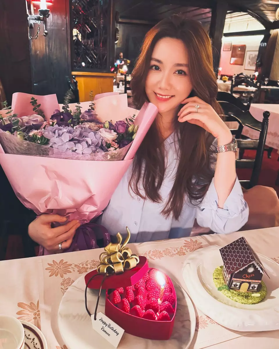 3月6日是靚湯的38歲生日,她在IG分享慶祝生日的照,可見她分享和老公外出享用晚餐,過二人世界,馬明還為為老婆準備了大束鮮花,以及心形禮物盒形狀的蛋糕;又見靚湯還與「2Line黨」好姊妹朱千雪、岑杏賢和蔣家旻,以及其他好友慶祝,同樣收到鮮花和不同的蛋糕,令靚湯有感而發道,「感覺自己很幸運能被最愛的朋友、珍貴的家人,以及出色的老公包圍,你們總是讓我感到特別,謝謝你們給我帶來的所有驚喜,我的愛人,你今年讓我大吃了一驚!」