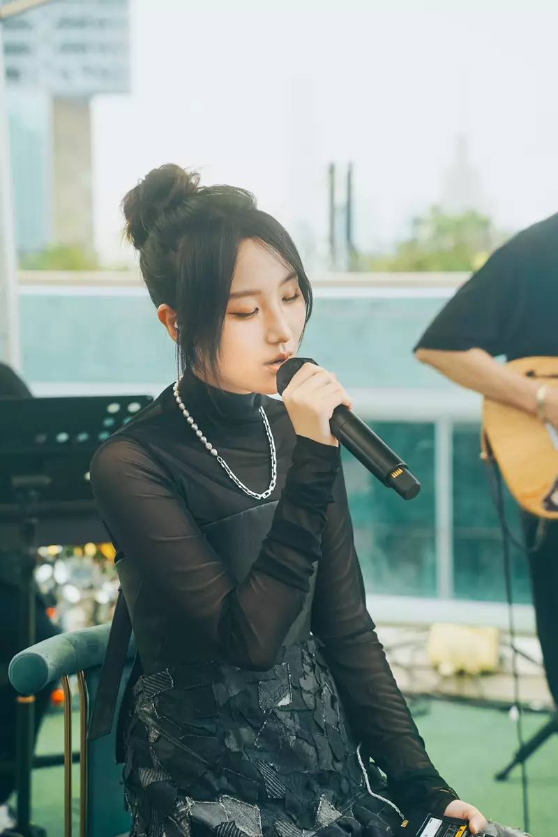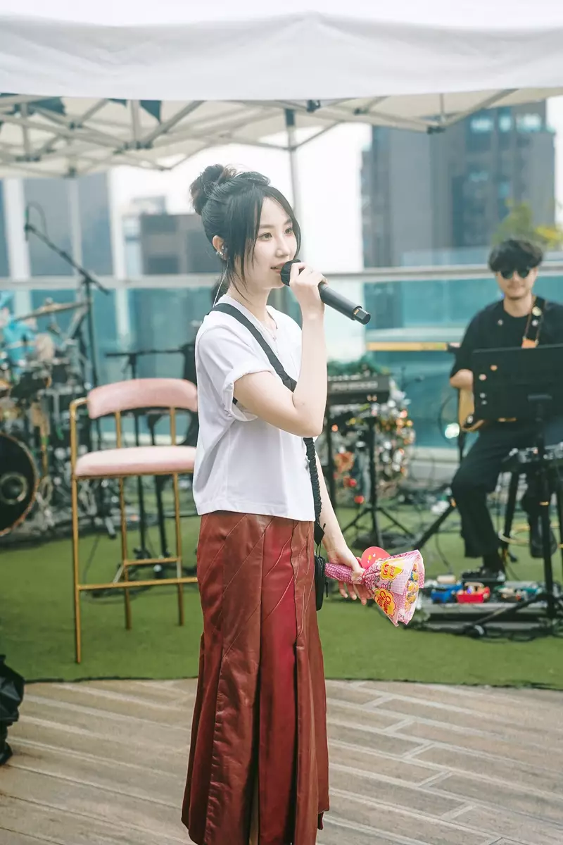 及後Windy換上隨性輕裝,簡單素色上衣配裙擺飄逸的棕紅色皮革長裙,知道粉絲引頸以待想繼續聽歌,立刻送上《麻煩彈開》再次炒熱全場氣氛,然後送上周杰倫的《楓》及她首支個人單曲《沒有你的新學期》。