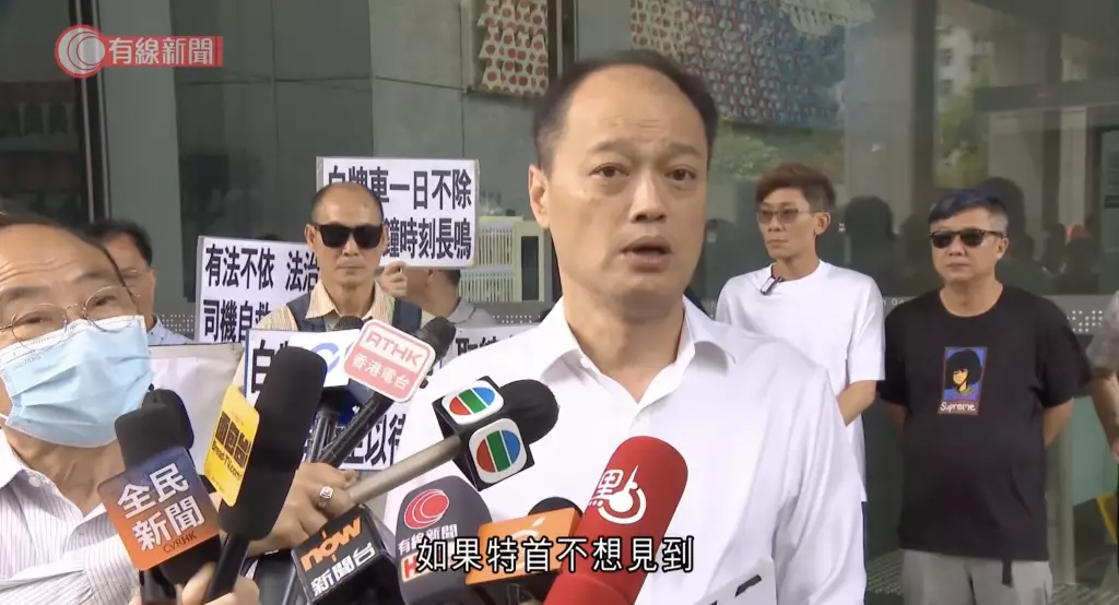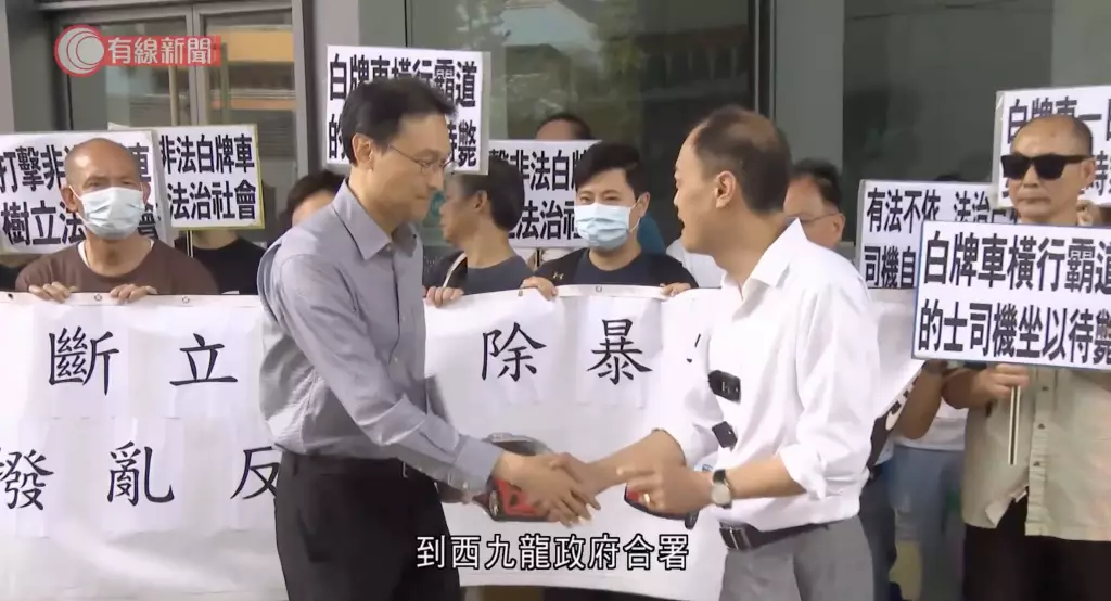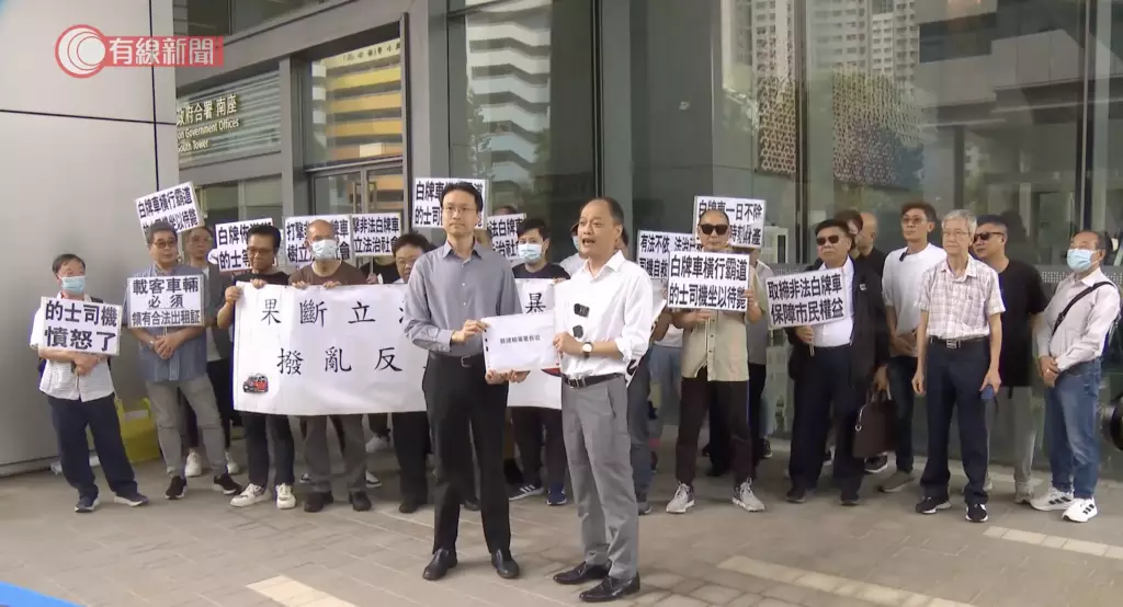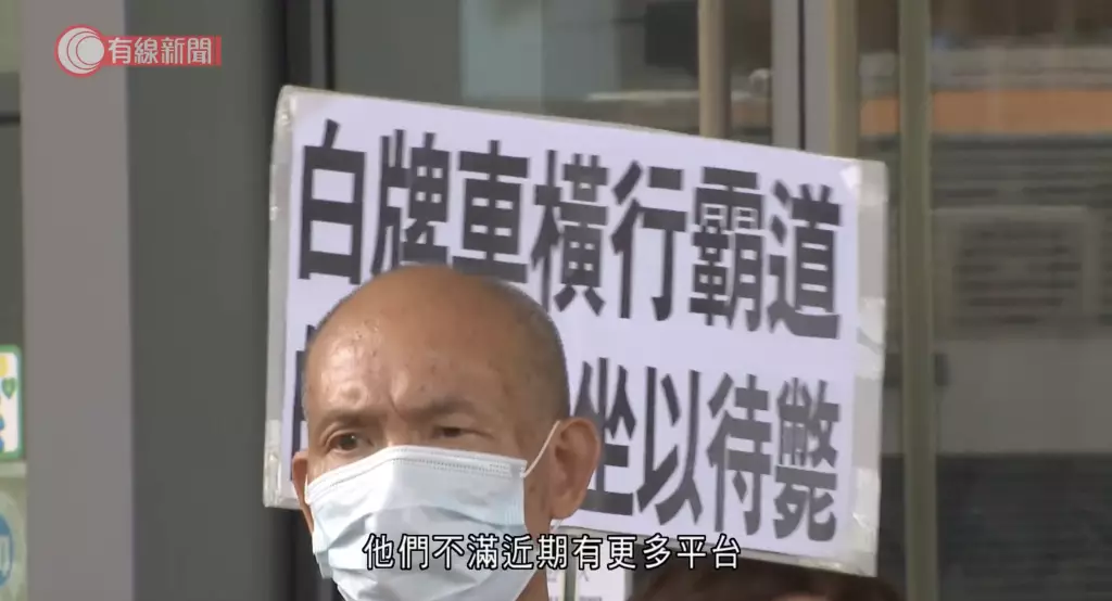 20多名的士業界人士到西九龍政府合署外請願,要求政府嚴厲打擊非法白牌車。