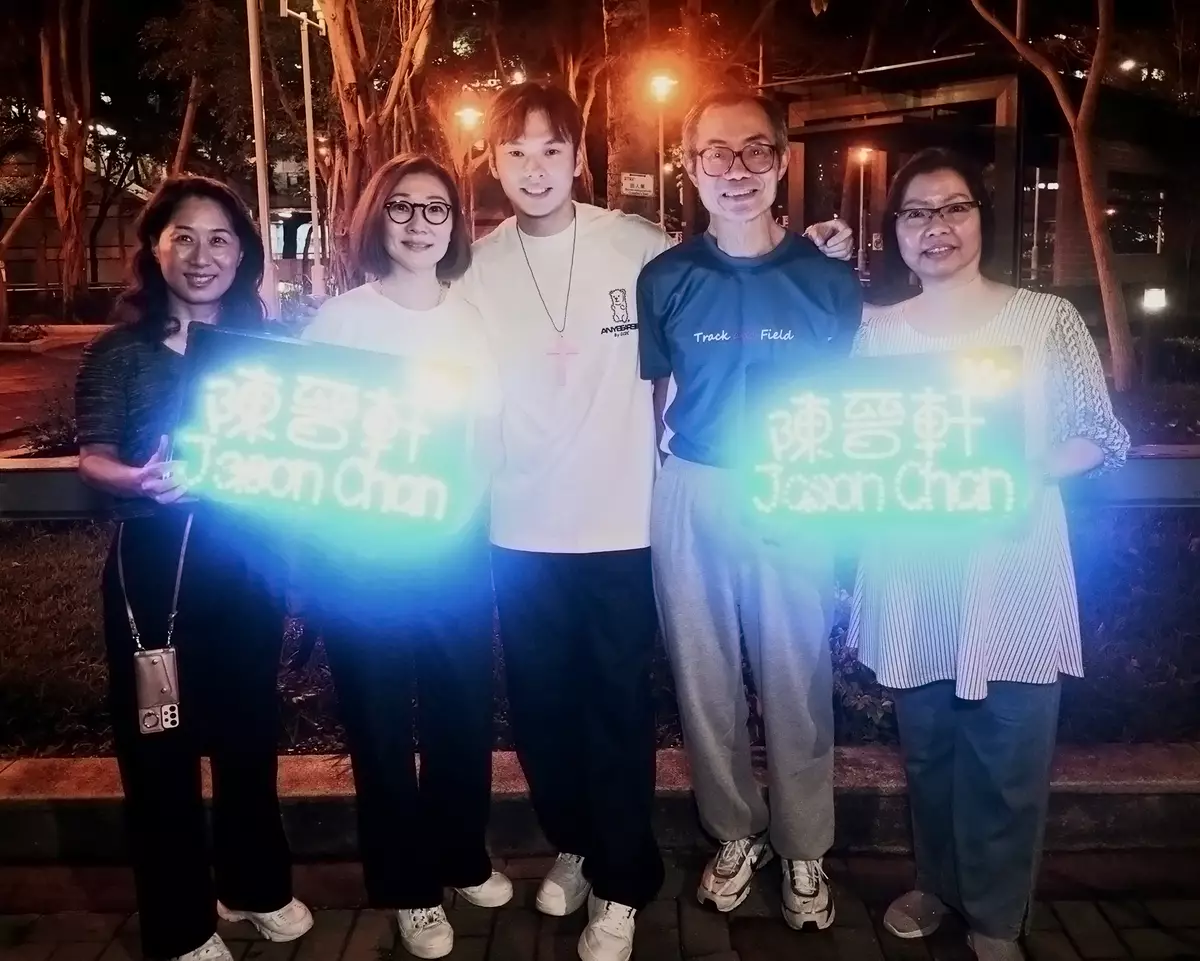 Jason媽媽(左二)及小學老師(右二)現身支持,令他驚喜又感動。