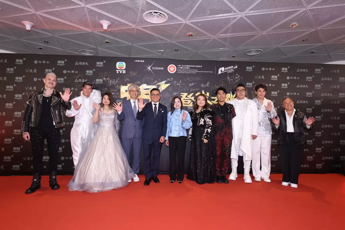 (左起)占士丁丁、張與辰、陳芷盈、電視廣播有限公司總經理 (商務營運) 蕭世和、行政主席許濤, JP、文化體育及旅遊局局長羅淑佩, JP、黃博、李金凱、劉洋、趙浚承、總經理 (節目內容營運)曾志偉