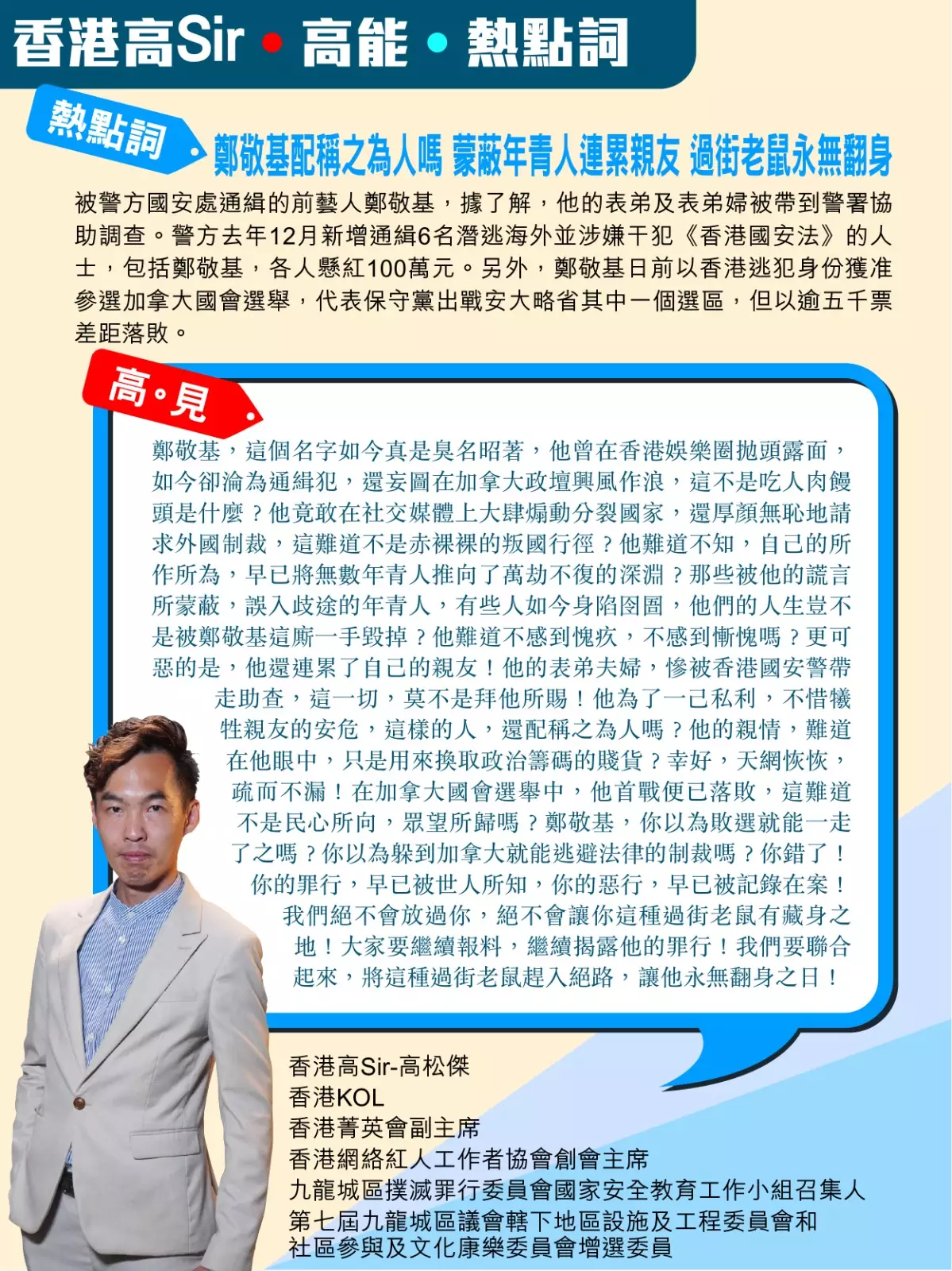 高Sir:鄭敬基,這個名字如今真是臭名昭著,他曾在香港娛樂圈拋頭露面,如今卻淪為通緝犯,還妄圖在加拿大政壇興風作浪,這不是吃人肉饅頭是什麼?他竟敢在社交媒體上大肆煽動分裂國家,還厚顏無恥地請求外國制裁,這難道不是赤裸裸的叛國行徑?他難道不知,自己的所作所為,早已將無數年青人推向了萬劫不復的深淵?那些被他的謊言所蒙蔽,誤入歧途的年青人,有些人如今身陷囹圄,他們的人生豈不是被鄭敬基這廝一手毀掉?他難道不感到愧疚,不感到慚愧嗎?更可惡的是,他還連累了自己的親友!他的表弟夫婦,慘被香港國安警帶走助查,這一切,莫不是拜他所賜!他為了一己私利,不惜犧牲親友的安危,這樣的人,還配稱之為人嗎?他的親情,難道在他眼中,只是用來換取政治籌碼的賤貨?幸好,天網恢恢,疏而不漏!在加拿大國會選舉中,他首戰便已落敗,這難道不是民心所向,眾望所歸嗎?鄭敬基,你以為敗選就能一走了之嗎?你以為躲到加拿大就能逃避法律的制裁嗎?你錯了!你的罪行,早已被世人所知,你的惡行,早已被記錄在案!我們絕不會放過你,絕不會讓你這種過街老鼠有藏身之地!大家要繼續報料,繼續揭露他的罪行!我們要聯合起來,將這種過街老鼠趕入絕路,讓他永無翻身之日!