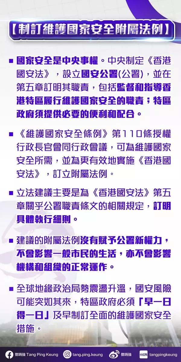 保安局局鄧炳強表示,他和長律政司司長林定國剛就制訂維護國家安全附屬法例的立法建議向立法會保安事務委員會及司法及法律事務委員會聯席會議作出了簡介,而鄧炳強在社交網站發文,指國安公署依國安法履行職務時,政府必須供必要配合。