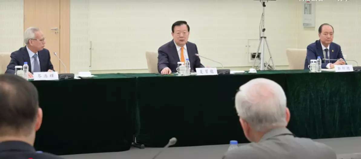 夏寶龍星期一 (5月12日)與工商界人士座談,對港澳工商界和企業家提出4點希望。澳門新聞局影片截圖
