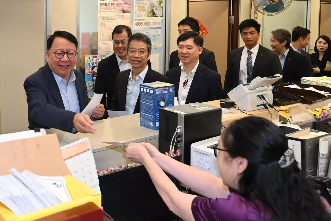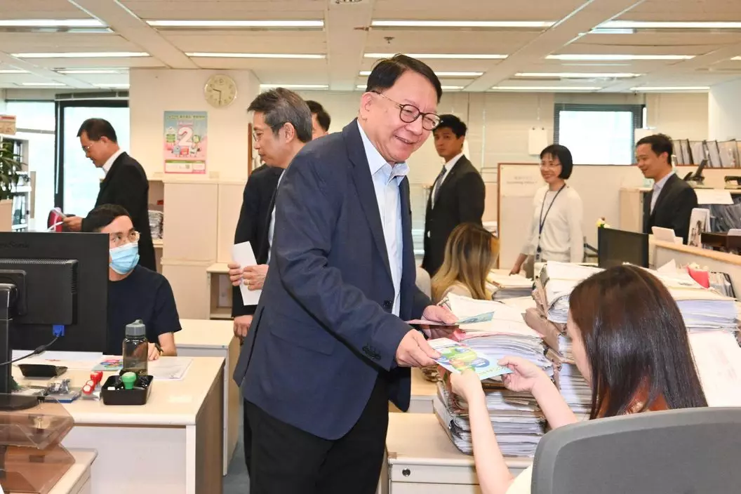 署理政制及內地事務局局長胡健民和公務員事務局常任秘書長梁卓文亦一同到場,並在大樓內向到訪市民派發選民登記或更新資料的宣傳單張,向他們傳遞有關信息。