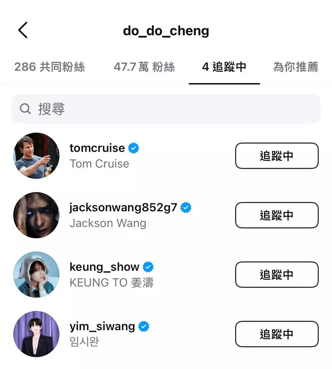 湯告魯斯立即得到Do姐的「認可」,成為她在IG第4位追蹤的對象!