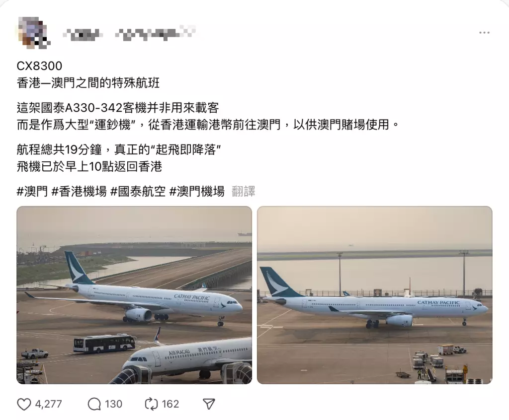 有資深網友就現身解畫,原來這班特殊航班並非載客,而是作為大型「運鈔機」,從香港運輸港幣前往澳門,「送去葡京間中銀」。航程總共19分鐘,是真正的「起飛即降落」,該網友又補充指該航班是包機,專門用來運鈔。