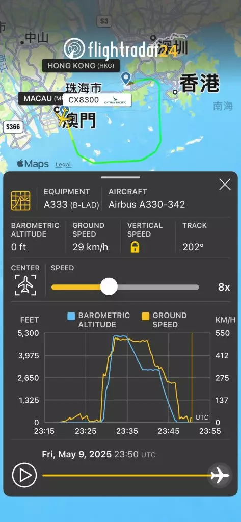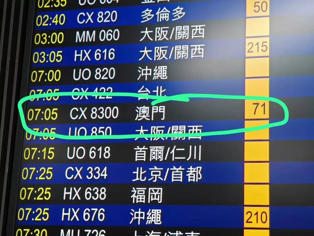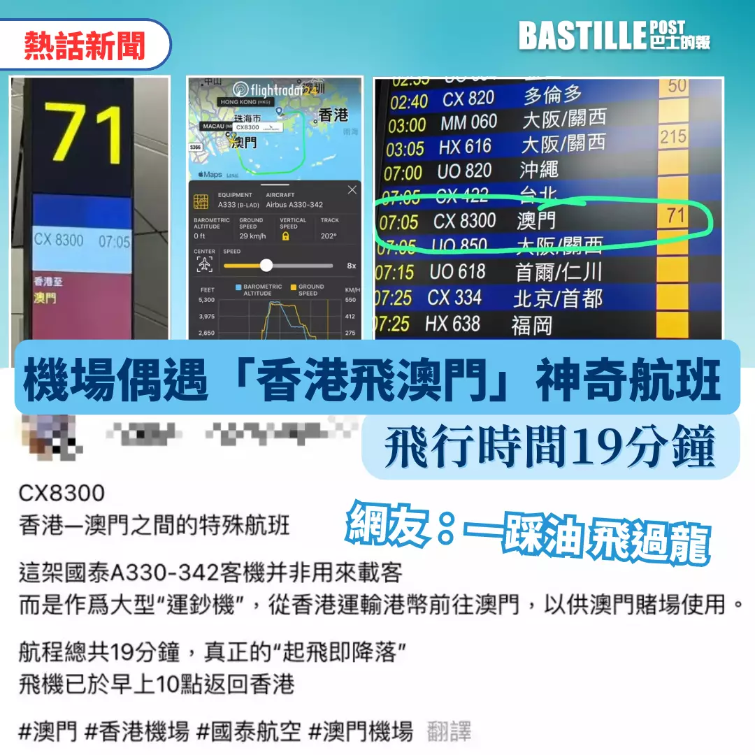 有網友在社交網站Threads上分享經歷,指日前在香港機場離境登機閘口71號閘,發現有一班編號CX8300的國泰航班,由「香港至澳門」,於早上7時05分起飛,覺得想到好奇,由於香港與澳門距離僅約63公里,兩地相距甚近,搭乘飛機又貴又不方便,因此引發網友的好奇疑問:「有咩人會搭?」