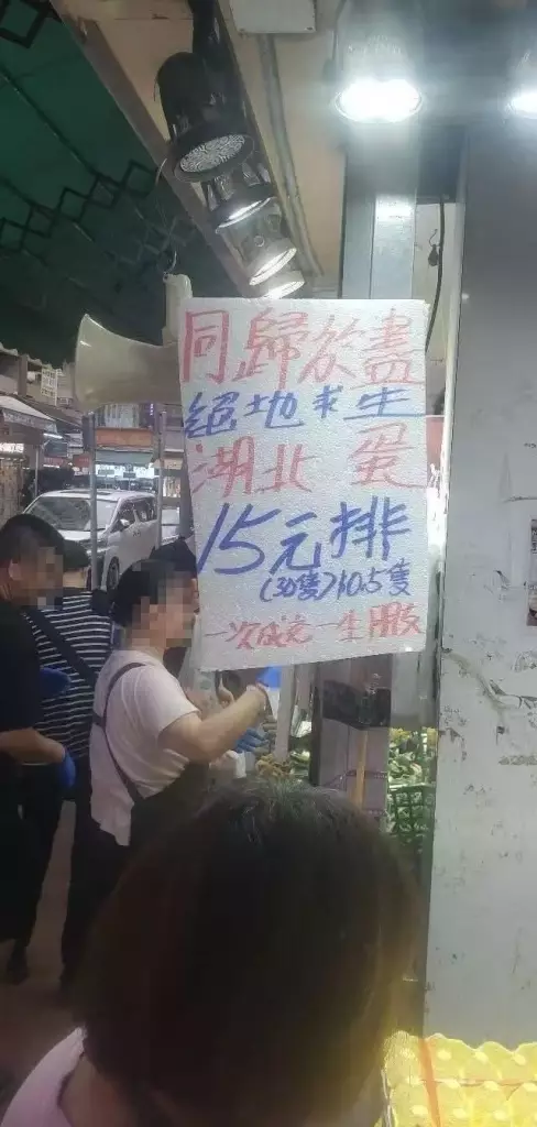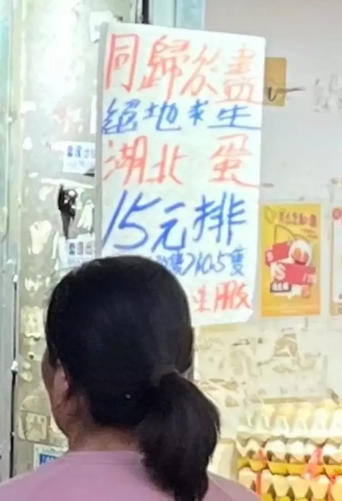 有網友近日在社交網站分享荃灣街市街的「街市文學」,只見相片中的檔主豎立起巨型發泡膠告示,以紅藍大字寫到:「同歸於盡絕地求生,湖北蛋15元排(30隻)」,意味著平均每隻雞蛋僅售5毫紙。有網民用「狼死」形容檔主降價之狠:「深水埗18蚊(一排雞蛋)我都覺得平,估唔到有人仲狼死。」