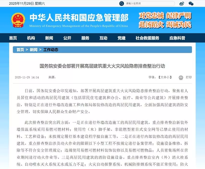 國務院安委會日前印發通知,部署開展高層建築重大火災風險隱患排查整治行動。應急管理部網站截圖
