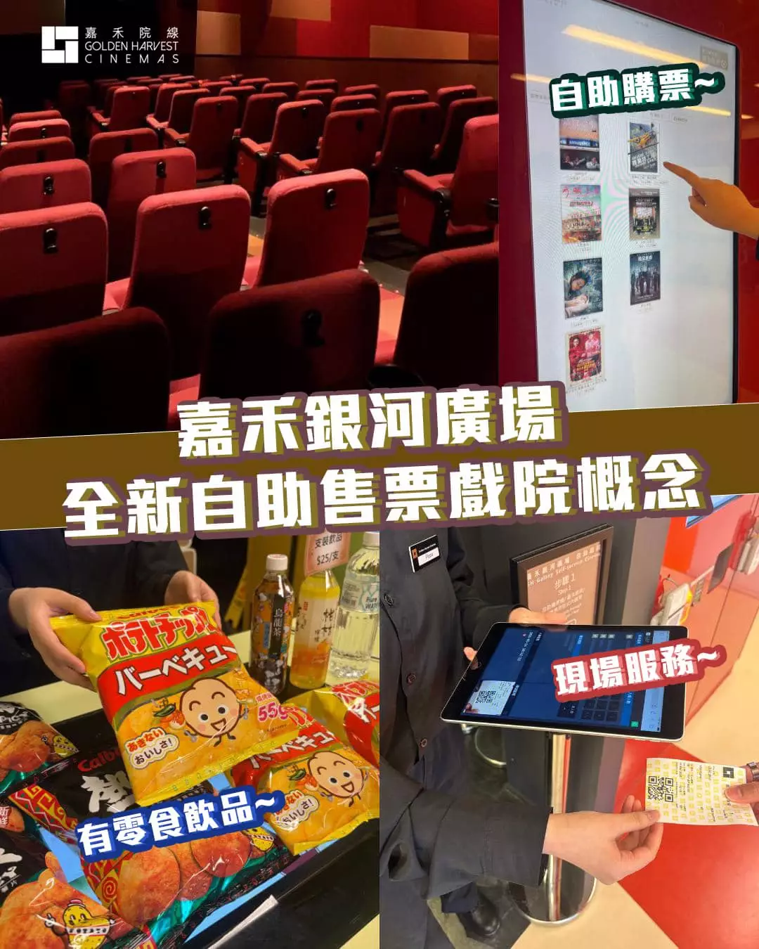 「嘉禾銀河廣場」的嘉禾院線,近日在社交平台專頁發帖,指全新「自助售票戲院」概念筲箕灣嘉禾銀河廣場即日起正式登場,觀眾可現場透過自助購售票機購票,亦可以提前用嘉禾院線網站、手機App或AlipayHK購票網上購票。帖文解釋雖然是「自助售票戲院」,但現場依然會有戲院職員為大家服務。包括於觀眾入場時檢查戲票或掃確認購票後所得的二維碼,所有影廳將於開場前5分鐘開放入座。職員亦會進入影廳巡視、定時清潔。