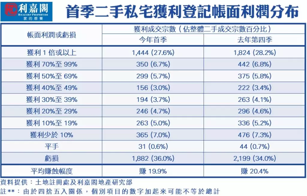 審視平均獲利幅度方面,今年首季每宗私宅轉手個案平均賺幅跌穿兩成,只有19.9%,較去年第四季的20.4%再跌0.5個百分點,除連跌7季外,更創2009年第四季以來的62季(即近15年半)新低,反映樓價持續下跌,加上無辣招限制,短線持貨業主沽貨,令整體平均賺幅未見止跌。當中,沽樓獲利1倍或以上的轉手個案佔整體二手私宅買賣比例仍然少於三成,只達27.6%,按季再跌0.6個百分點,涉及宗數達1,444宗。此外,今年首季虧損個案錄得1,882宗,佔比增至36%,相關比例按季增加2個百分點,以宗數計,為2009年第四季以來的62季(即15年半)第三多,反映無辣招制約及經濟未穩下,蝕讓沽售情況仍普遍;至於平手者則有31宗,佔比按季微跌至0.6%。