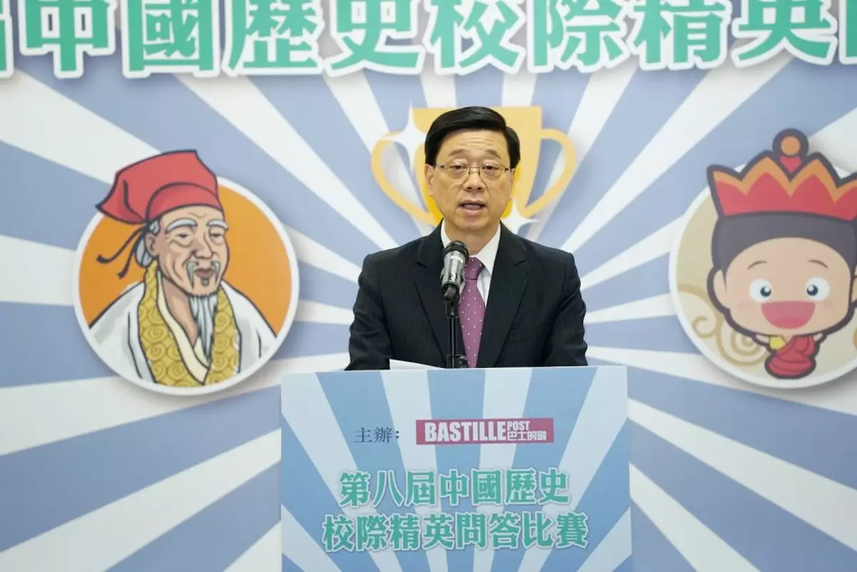 行政長官李家超在第八屆「中國歷史校際精英問答比賽」總決賽上致辭。巴士的報記者攝
