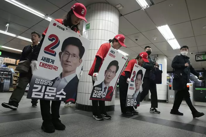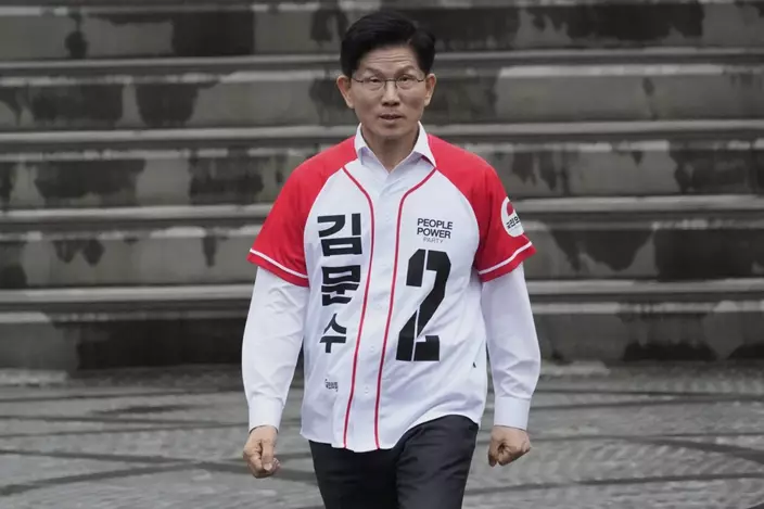 尹錫悅籲支持國民力量黨總統候選人金文洙。AP圖片