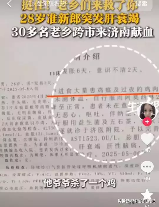 山東濟寧一名28歲准新郎馬彬,因誤食變質滷味及帶有雞瘟病毒的雞肉,引發急性肝衰竭等多重器官損傷,經醫院搶救及30餘名群眾捐獻2萬毫升血液後,仍於5月15日晚間離世。